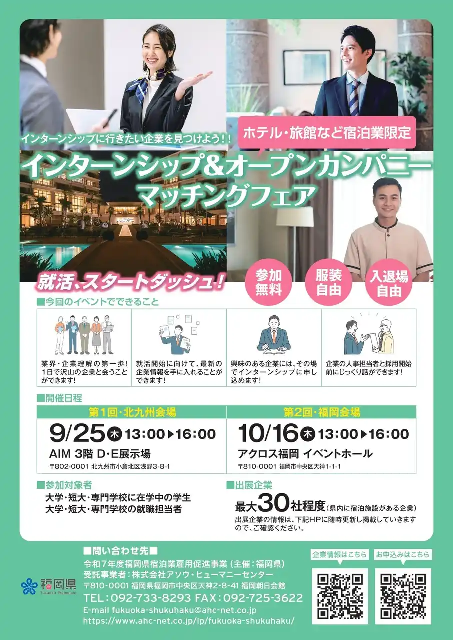 このことから、福岡県では、宿泊業への就職を促進するため、学生の皆さんに宿泊業の魅力を知っていただくとともに、学校・学生の皆さんとインターンシップを導入している宿泊事業者をつなぐマッチングフェアを開催します。 |