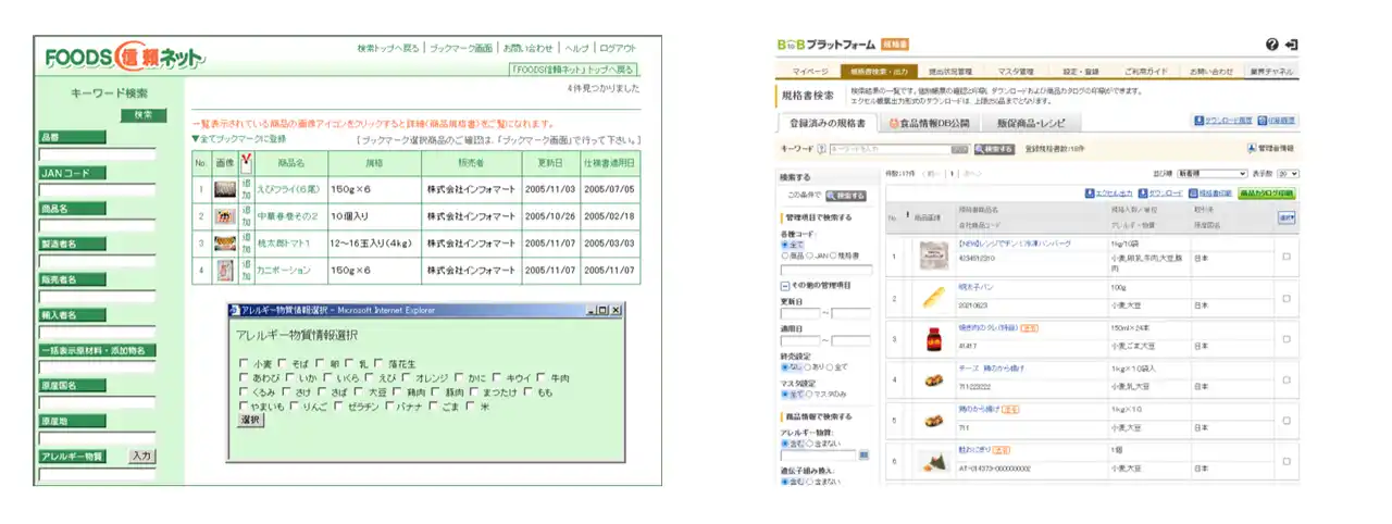 (左)「FOODS信頼ネット」検索画面/(右)現在の「BtoBプラットフォーム 規格書」検索画面 |