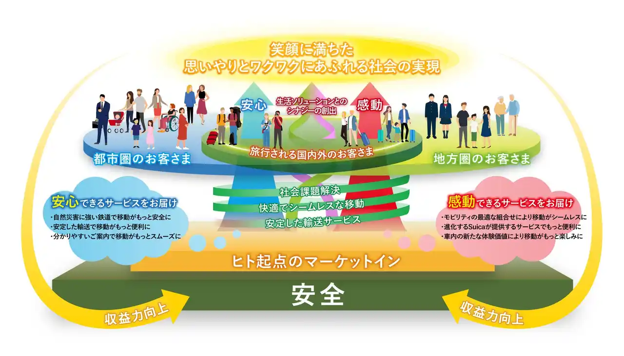 輸送障害の防止と発生時の対応力強化により輸送品質を高めつづけるとともに、新幹線車両増備などによりさらなる輸送力強化を推進します。加えて、長距離夜行特急列車など移動が楽しくなる付加価値の高い移動空間、コンサートの戦略的誘致などによる魅力的な目的地の創出、およびインバウンド向けプロモーション強化などにより、交流人口の拡大を図ります。さらに、モビリティの資産である鉄道用地を再編・開発し、生活ソリューションとのシナジーにより地域の拠点と新たな流動を創造していくことで、収益力を向上させていきます。 |