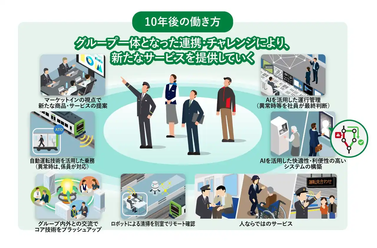 持続可能な事業運営に向け、ロボットやAIなどの新技術を活用・開発してオペレーションやメンテナンスの省力化・省人化と業務の変革を推進します。また、鉄道システム・車両の販売など、グループの技術力を活かして事業領域を拡大し、鉄道をはじめとしたモビリティネットワークの発展に貢献します。 |