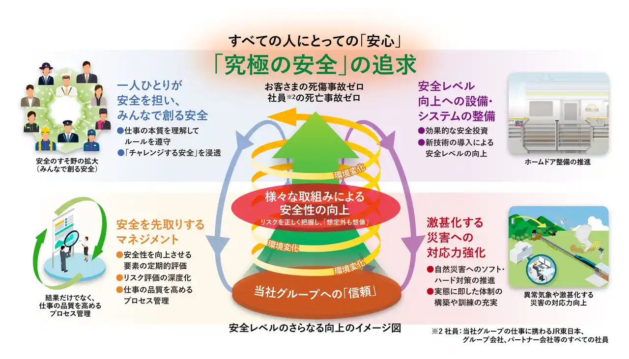 例えば、デジタルツインやAIなどを活用し、環境変化に応じた「想定外を想像する」取組みを推進します。また、ホームドアをはじめとする設備・システムの整備を着実に推進するとともに、衛星を活用した踏切保安システムなど新技術の導入により、2031年度までに鉄道運転事故30%減・ホームにおける鉄道人身障害事故80%減(2023年度比)などの実現をめざします。 |
