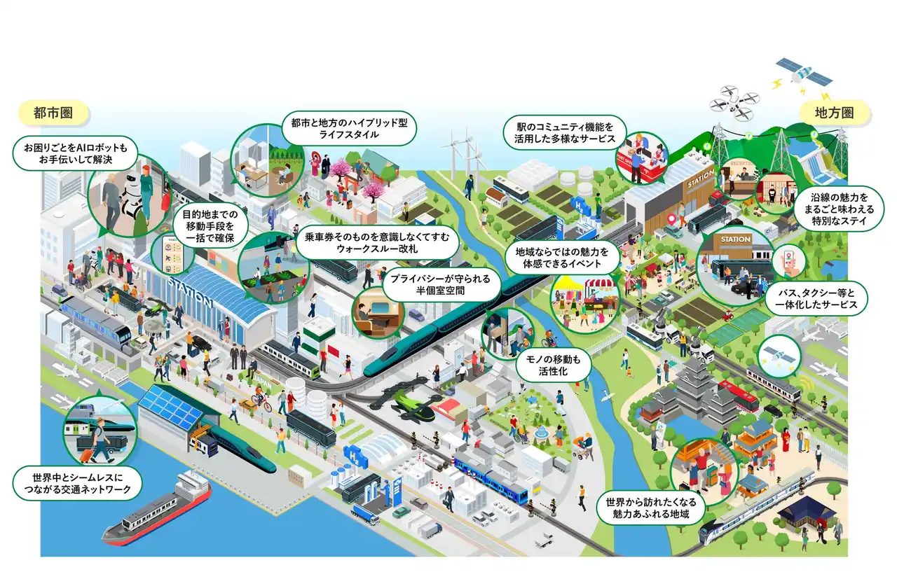 この4つのアプローチにより、環境に優しく時間に正確で大量高速輸送が可能な鉄道と、駅から目的地まで柔軟に移動できるバス・タクシーなどの輸送モードを最適な形で組み合わせる「モビリティのベストミックス」を私たちが主体となって構築し、多様化するお客さまの移動ニーズにきめ細かくお応えし、すべてのヒトの心豊かな生活を実現します。 |