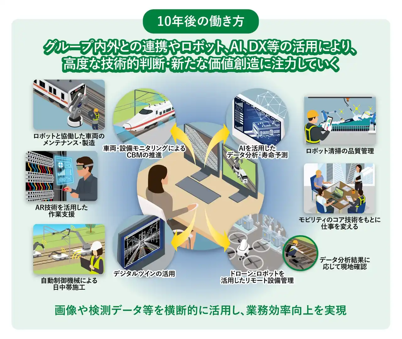 社員はAIを活用し、ロボットと協働しながら、従来の定型的業務から軸足を移し、自らが「主役」となり新たな価値創造に注力します。具体的には、「オペレーション」においては、社員は「人ならでは」のサービスや異常時対応に注力します。「メンテナンス・工事・製造」においては、画像や検測データを横断的に活用し、社員は高度な技術的判断に注力することで、業務効率向上を実現します。 |