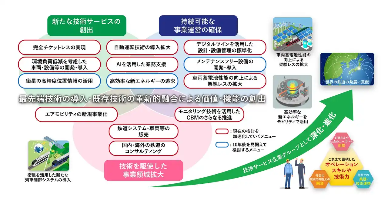培ってきた技術の深化と最先端の技術を結束し、技術サービス企業グループとして、技術に磨きをかけ、「究極の安全」を推進するほか、新たな商品・サービスを創出し提供します。具体的には、マーケットインの視点で完全チケットレスやウォークスルー改札の実現、衛星を活用した列車制御システム、高効率な新エネルギー(水素・フュージョンエネルギー)の追求など、新たな技術サービスの創出に挑戦していきます。 |