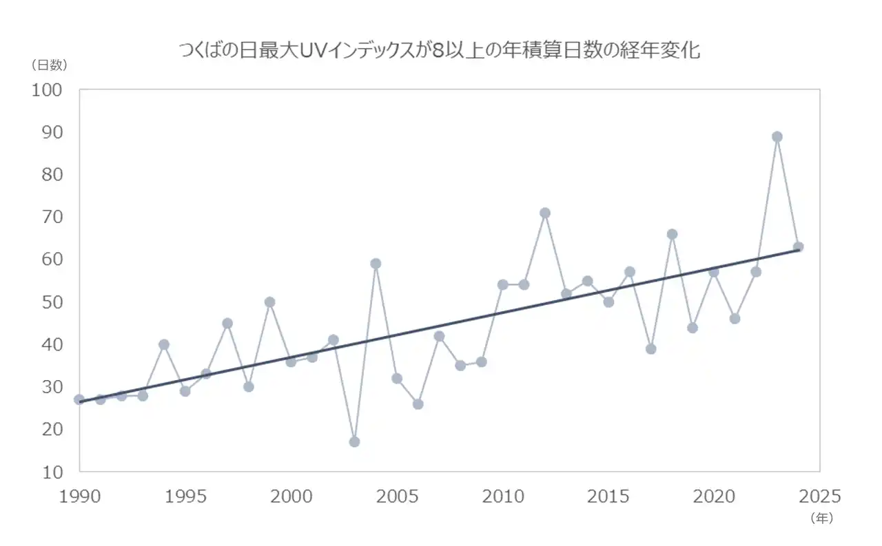 気象庁によると、茨城県つくば市では、1990年の観測開始以降、日最大UVインデックス8以上の日が10年間で13日増加しており、日中の外出時は極力控え、外出の際には長袖シャツや日焼け止め、帽子などの紫外線対策を行うような特に配慮が必要な日が増えています。 |