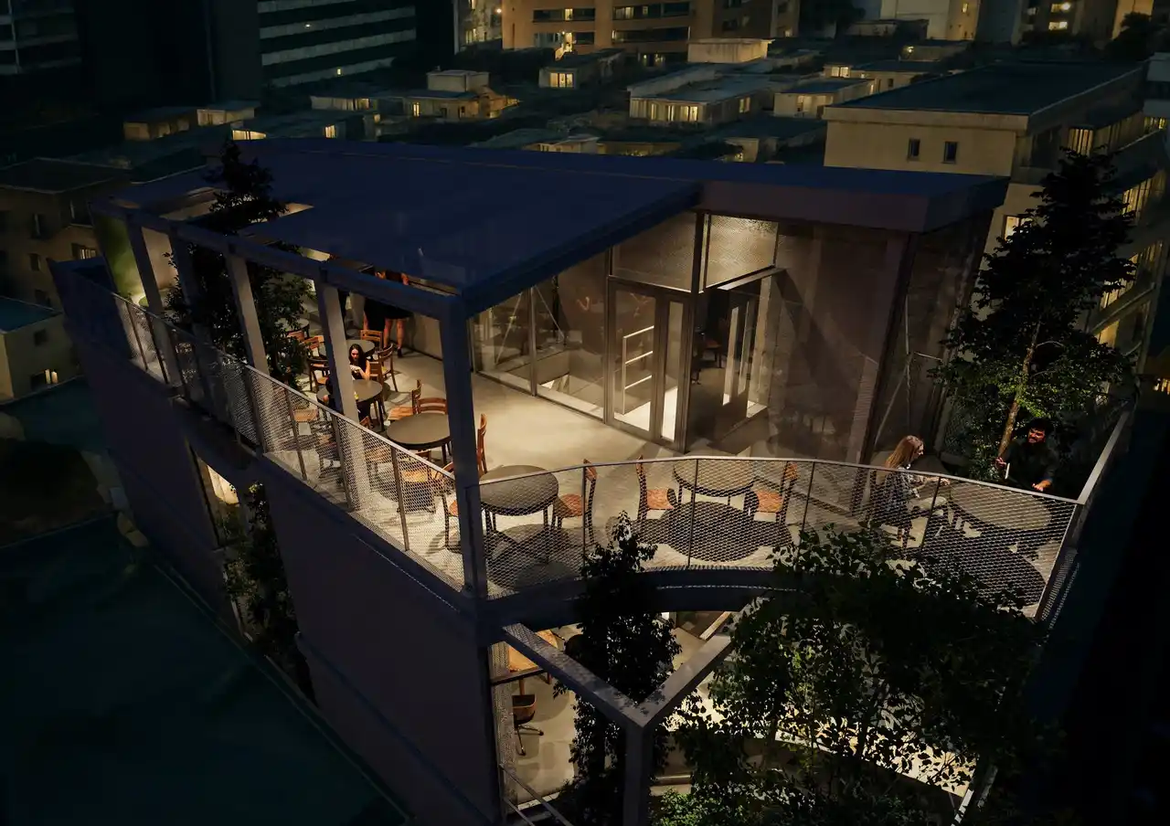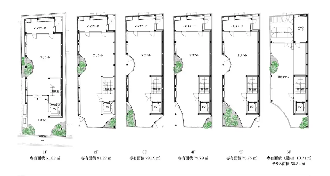 構成:地上6階、1-2F飲食/3-5F非飲食/6F屋上テラス(飲食可) 面積:延床462.5平方メートル 、専有406.04平方メートル 、想定建築費見積額5.5億円 空間特性:各階に坪庭を配し、自然光と通風を取り込む設計。 |