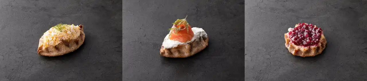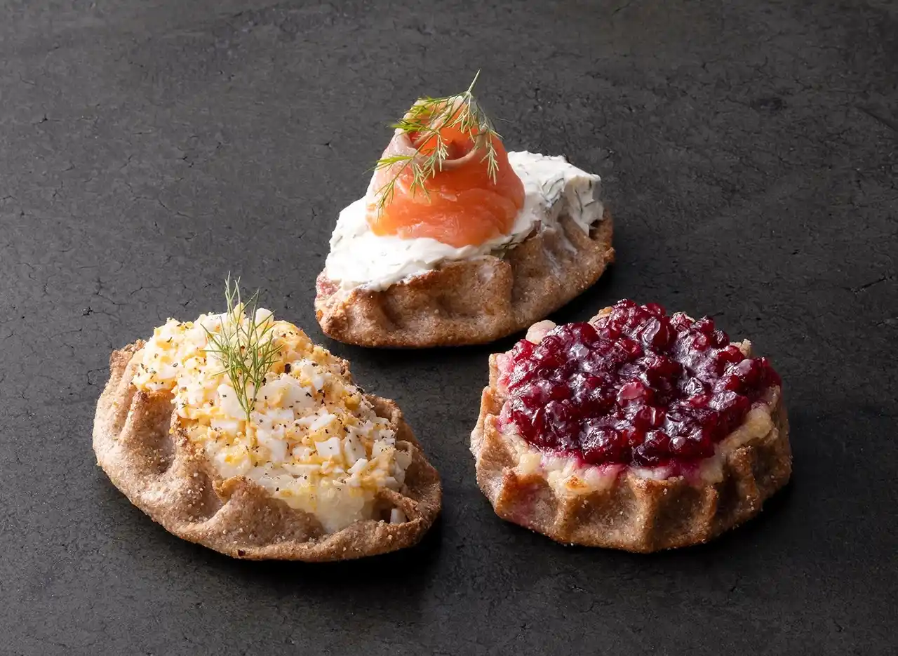 左から カルヤランピーラッカ+ムナボイ(エッグバター)/カルヤランピーラッカ+スモークサーモン / ペルナピーラッカ+リンゴンベリージャム (C)Shinya Kigure |