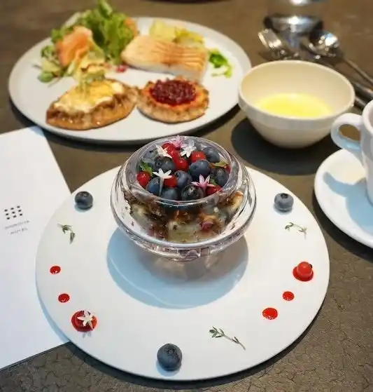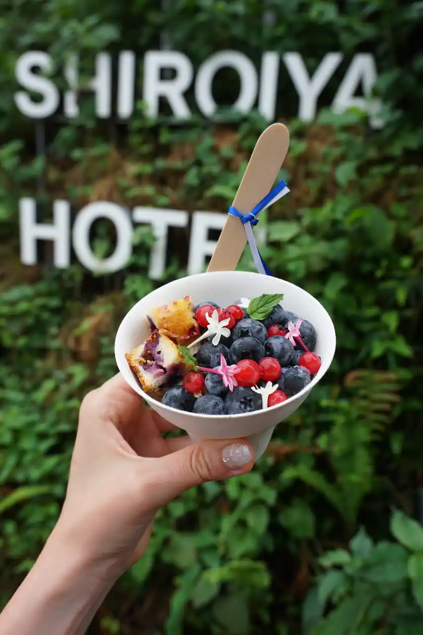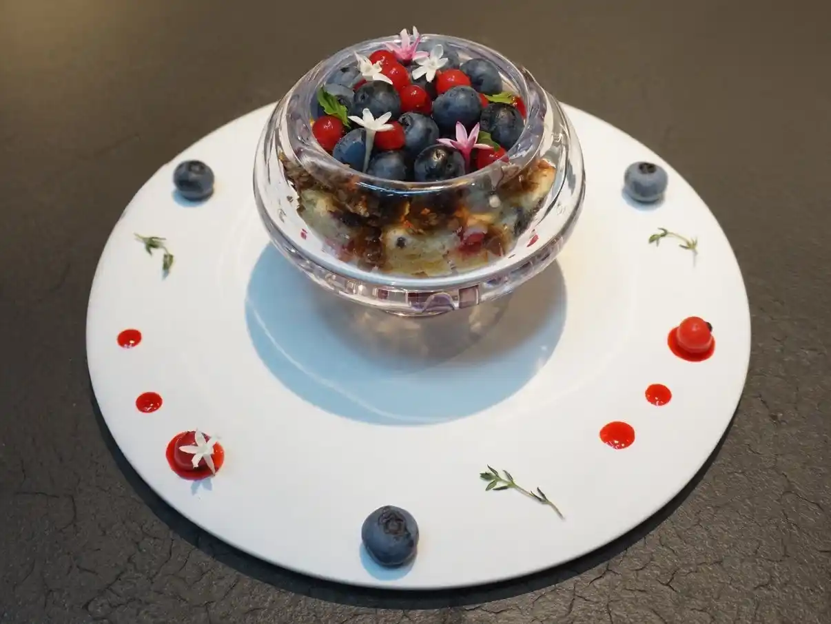 ブルーベリー、リンゴンベリー、ベリーのタルト、オーツ麦のアイスクリーム、クランブル、エディブルフラワーのペンタスやミントを合わせた贅沢パフェ。 |
