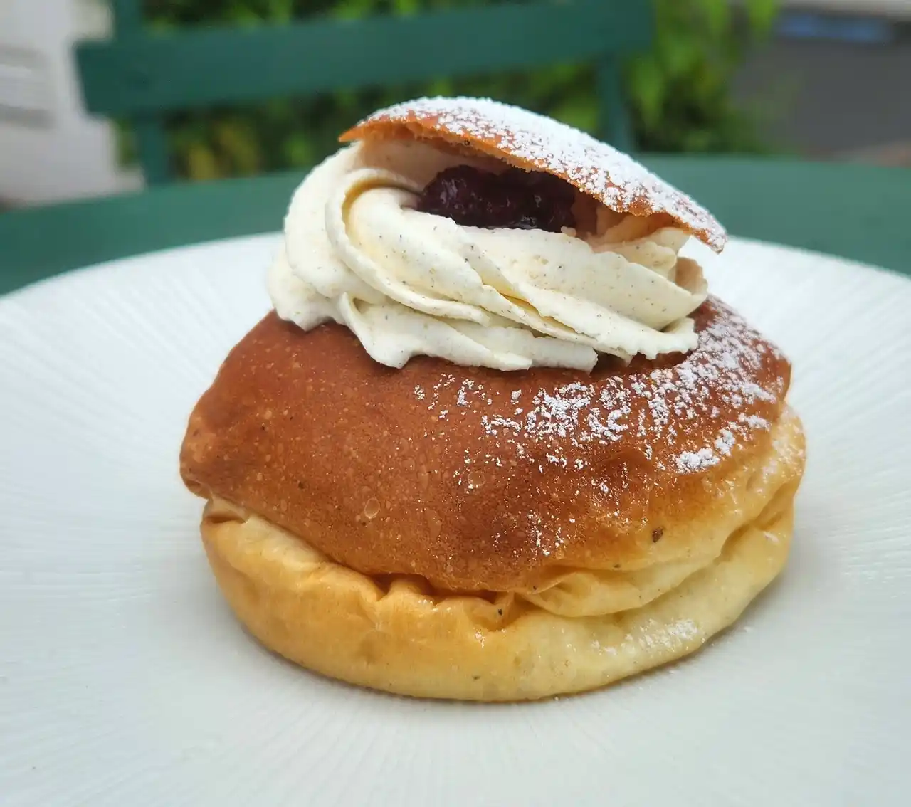 カルダモンが香る丸いふわふわパンにホイップクリームをたっぷり入れ、本来はジャムかアーモンドペーストを挟んだものですが、今回はジャムもアーモンドペーストも両方入れた、贅沢な白井屋バージョンをおつくりしました。 |