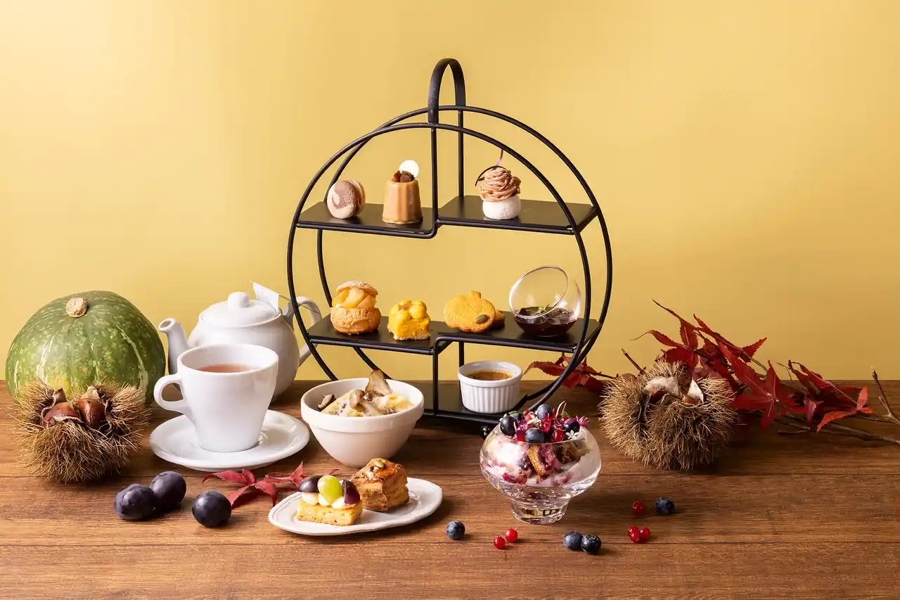 ◎10種のスイーツ:キャラメルマカロン、マロンカシス、モンブラン、シューポムキャラメル、かぼちゃのチーズタルト、かぼちゃのサブレ、巨峰のジュレ、かぼちゃのブリュレ、ぶどうのタルト、かぼちゃのスコーン |