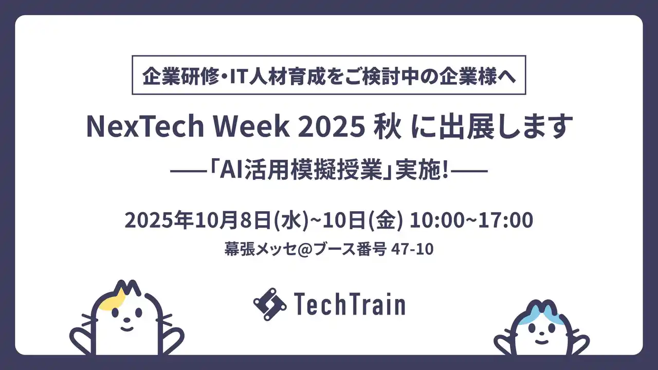 「テクノロジーを支える、全ての人のターミナルに。」を掲げるTechTrain(株式会社TechBowl 本社:東京都千代田区、代表取締役社長:小澤 政生、以下「TechTrain」)は、2025年10月8日(水)~10日(金)に幕張メッセで開催される「NexTech Week 2025 秋」に出展いたします。 |