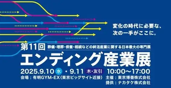 広済堂グループの東京博善株式会社(本社:東京都港区、代表取締役社長 野口龍馬、以下「東京博善」)は、2025年9月10日(水)・9月11日(木)の2日間、有明GYM-EX(ジメックス)にて終活業界最大規模のイベント「エンディング産業展2025」(提供:ナカタケ株式会社)を開催し、過去最多の来場者数である13,688名を記録しました。また、来年度の開催日が2026年9月10日(木)~9月11日(金)に決定したことをお知らせいたします。 |