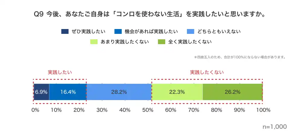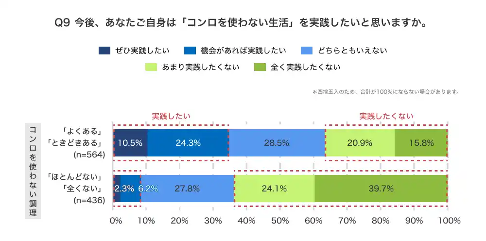 「コンロを使わない生活を実践したいと思うか」を聞いたところ、「ぜひ実践したい」と「機会があれば実践したい」を合算した「実践したい」派は2割強(23.3%)でした。一方、「あまり実践したくない」と「全く実践したくない」を合算した「実践したくない」派は5割弱(48.5%)となりました。