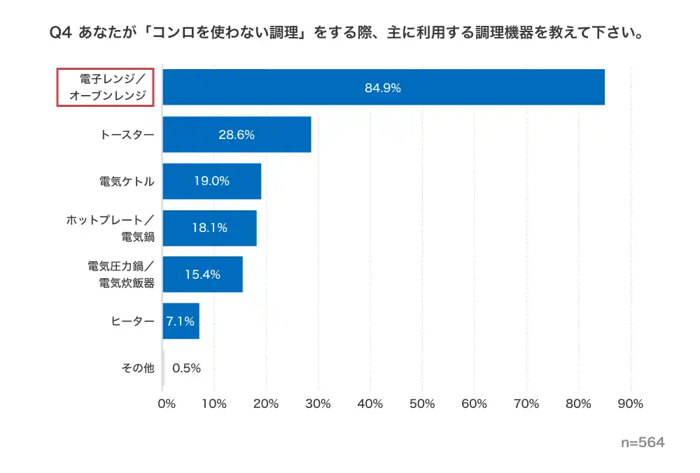| 「コンロを使わない調理」をする際、主に利用する調理機器を聞いたところ、別の設問で所有率が最も高かった「電子レンジ/オーブンレンジ」(84.9%)が他製品を引き離し、利用率でも圧倒的な結果でした。コンロの代替機器としての存在感が際立っており、その傾向が鮮明になっています。 | |||||||||||||||