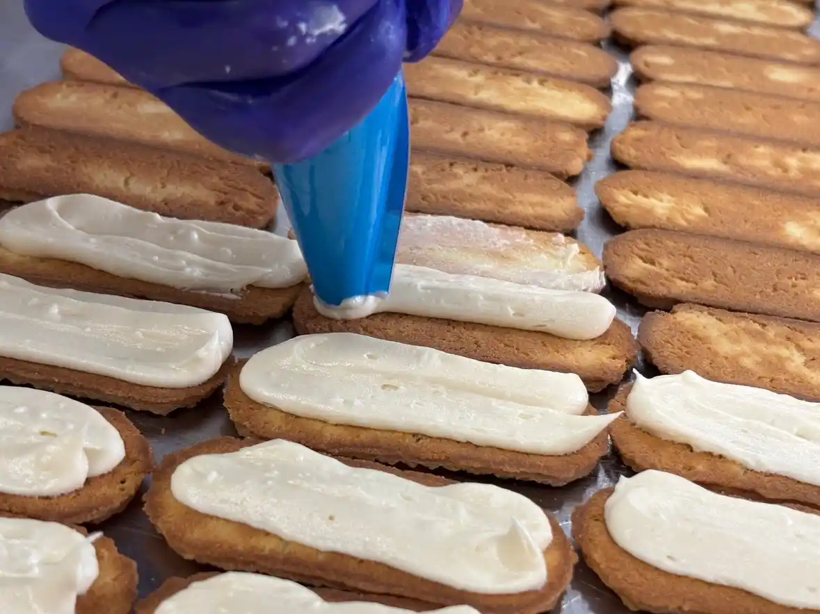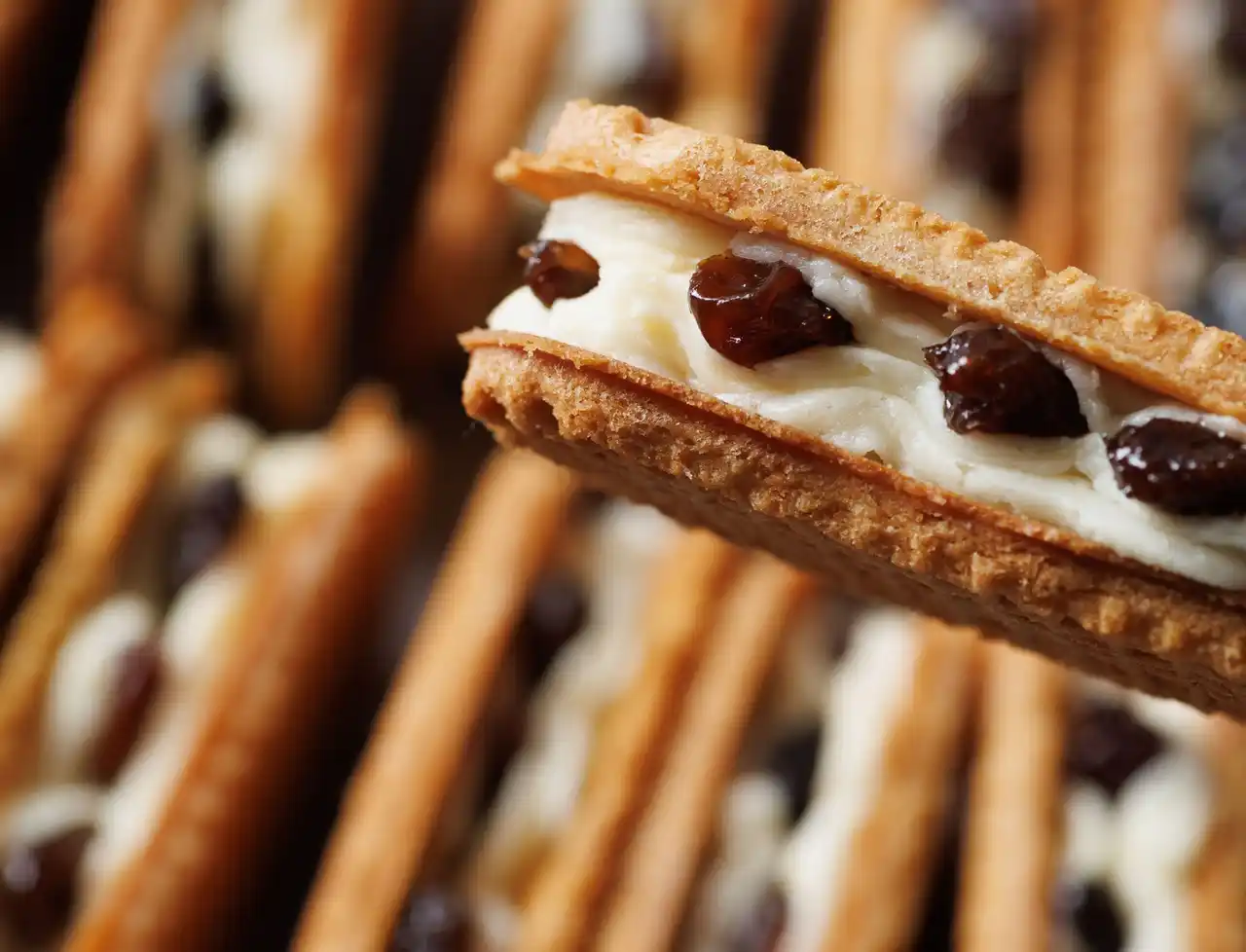 手焼きのクッキー生地に手絞りのバタークリーム、そして一粒ずつ手で並べられたレーズンをサンドするまで全ての工程を手作業で行っています。手作業だからこその味わい、食感を感じていただけます。 |