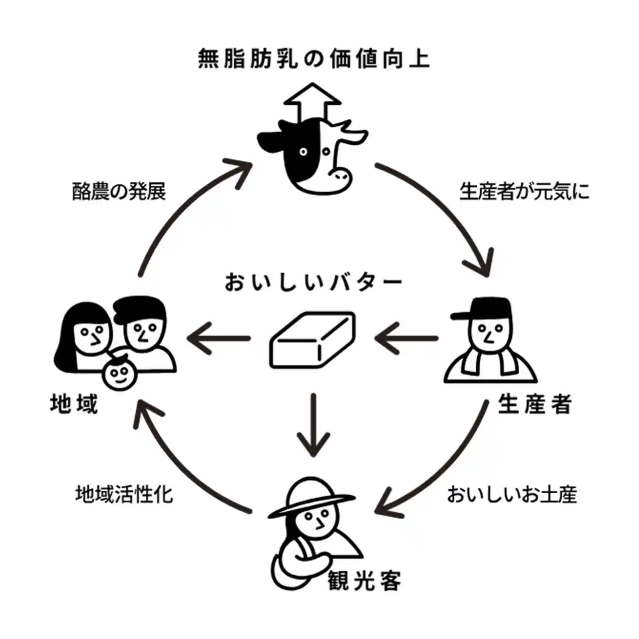 そんな思いから、”スキムミルク”を主役にしたお菓子を作ろうと生まれたのがこの「バターのいとこ」です。「美味しい!」「可愛い!」とお手に取っていただいた背景に、小規模酪農家の支援やインクルーシブな雇用創出といったストーリーを感じていただくことで、生産者も、地元の方も、食べる方も、みんなの笑顔を循環させる「三方よし」なお菓子です。 |