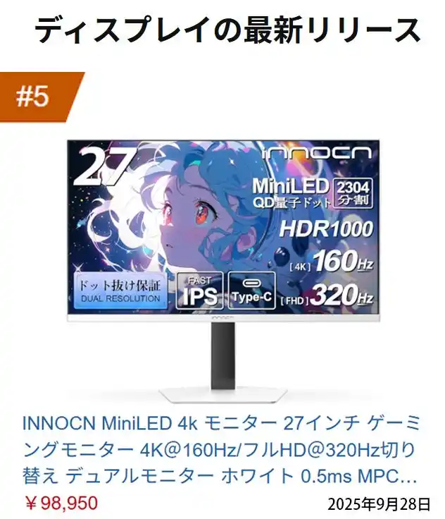 ゲームの世界では、1フレームの差が勝敗を決めることがあります。しかし同時に、壮大なグラフィックに没入したい瞬間もある。その両方を1台で満たすために開発されたのが、INNOCN GA27V1Mです。そんな制約を打ち破るのが、GA27V1M。Mini LEDテクノロジーと最大320Hzリフレッシュレートを兼ね備えた、この27インチゲーミングモニターは、ゲーマーを新たなステージへと導きます。
