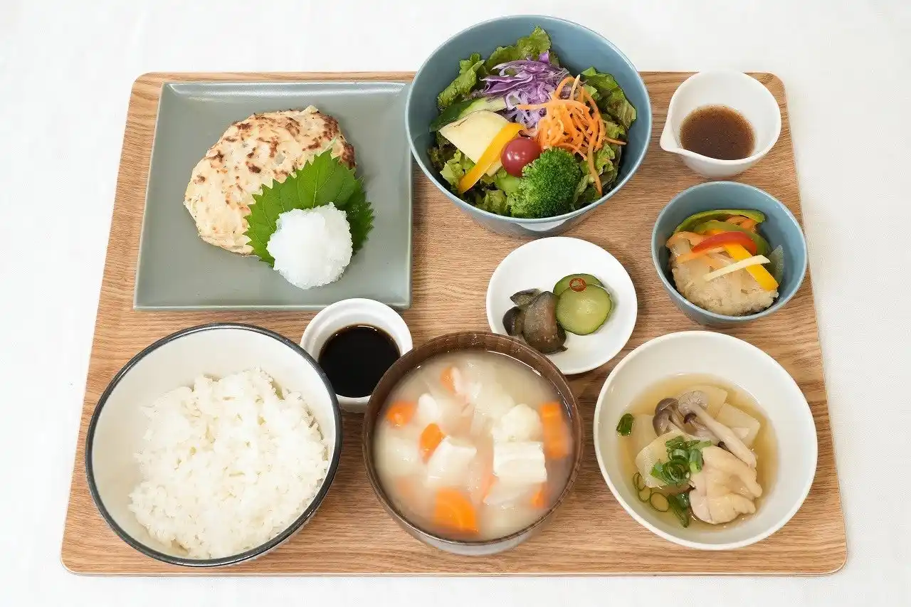 鶏むね肉の豆腐ハンバーグ(+ごはん、みそ汁、サラダ、小鉢2種、漬物)1,700円(税別) |