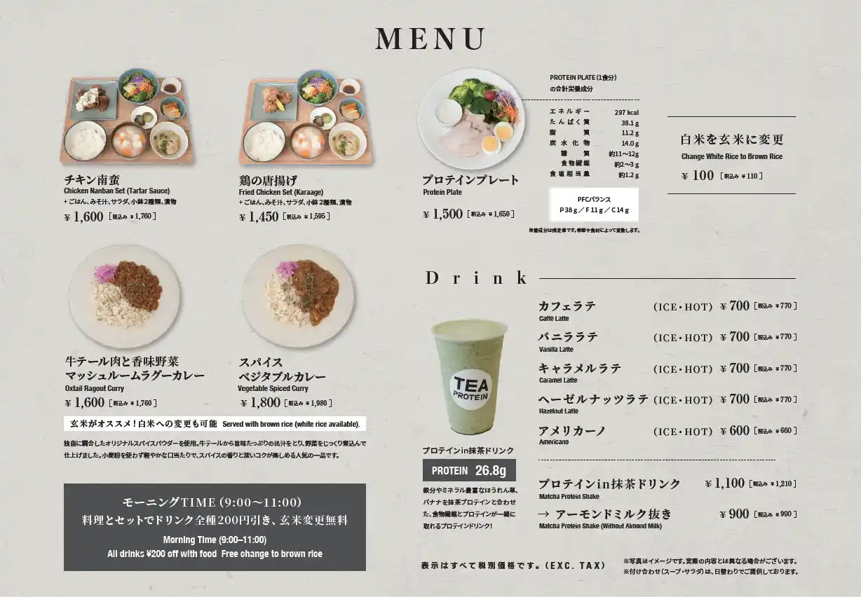 他にも、ミートドリアや鶏とキノコのクリームパスタ、小麦粉不使用のスパイスベジタブルカレーなど、洋食メニューも充実。ジム帰りのお客様におすすめの、鶏のむね肉、ブロッコリー、ゆで卵などを組み合わせたプロテインプレートや、抹茶味のプロテインにバナナ、ほうれん草、ブルーベリー等を加えたプロテインin抹茶ドリンクもご用意しています。 |