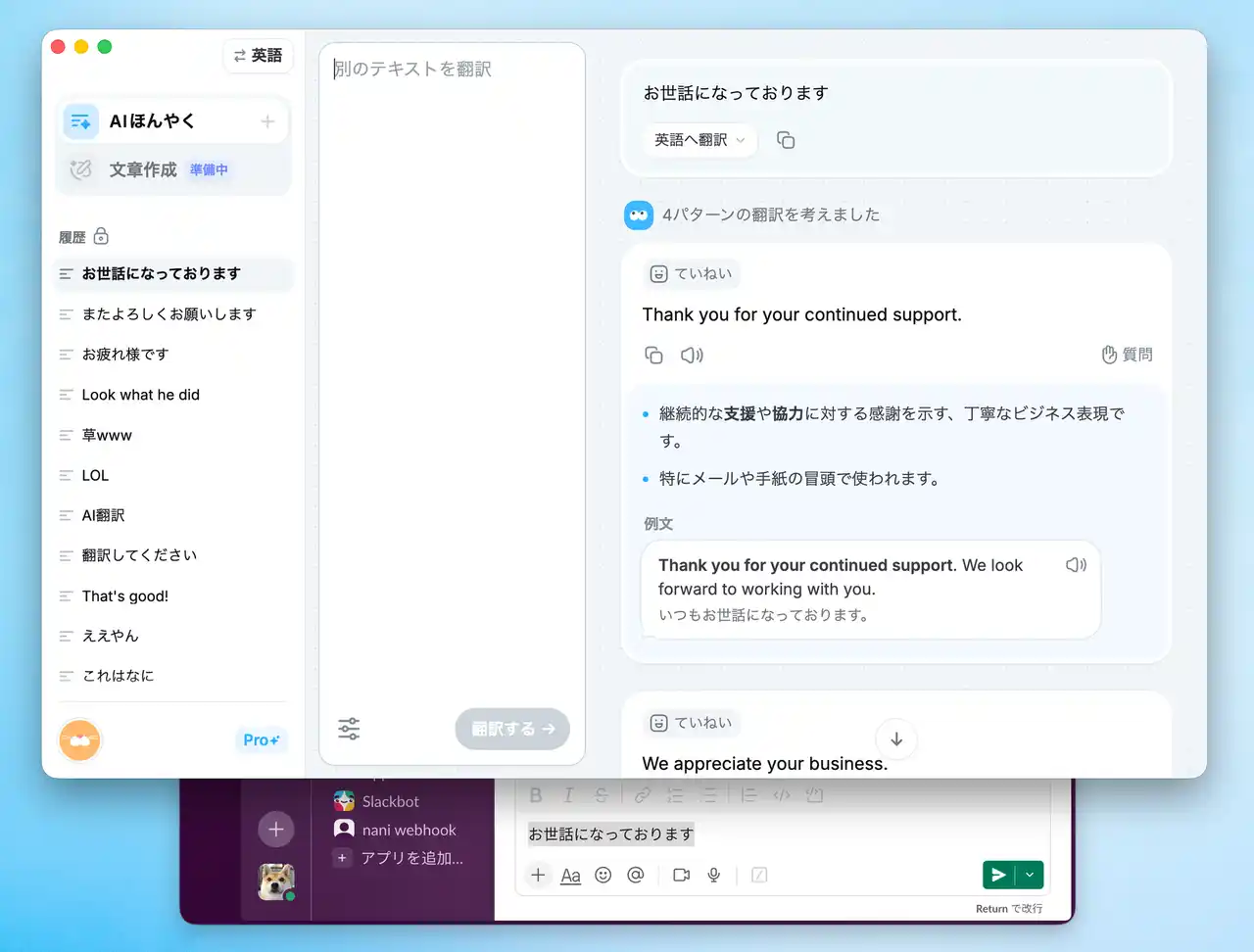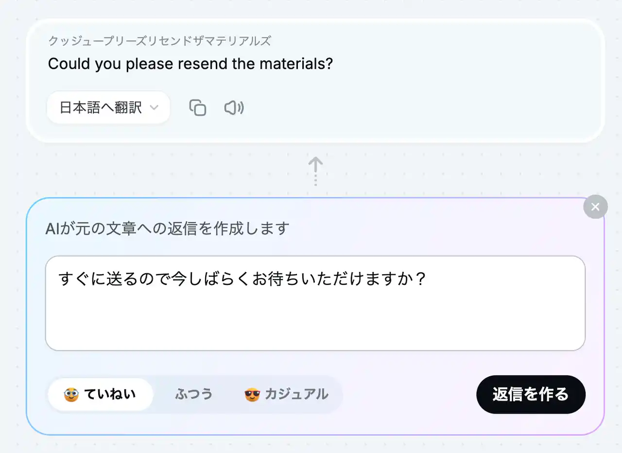 従来の“1入力=1訳”の翻訳ツールとは異なり、複数の言い回しの提案に加え、AIによりニュアンスや使い分けの解説までチェックすることができます。翻訳後には、原文と同じ言語でAIにより返信文を作成することもできます。 |