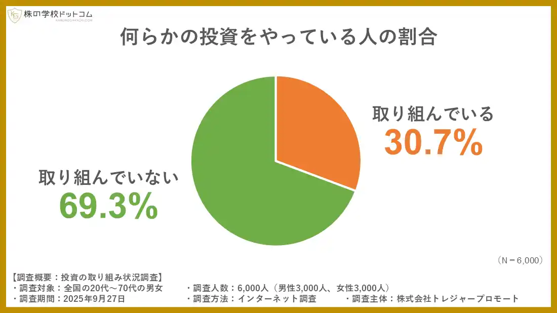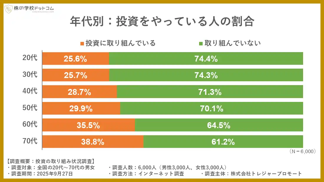 20代~70代の男女6000人を対象にした調査の結果、株や債券、投資信託、不動産など何らかの投資活動に取り組んでいる人は全体で31%となりました。投資を行うことが「当たり前」と言える世の中になるには、まだまだ道半ばのようです。 |