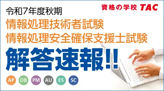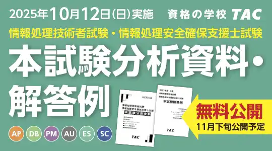 | TACでは、次回2026年春期の受験に対応した情報処理技術者試験全区分と情報処理安全確保支援士試験の講義映像付きコースを開講しております。詳細はTAC情報処理講座ホームページにてご確認ください。 | ||||||||||||||||||