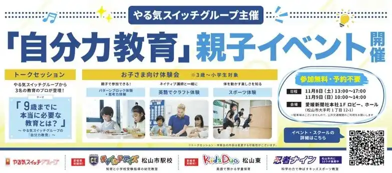 総合教育サービス企業の株式会社やる気スイッチグループ(東京・中央区、代表取締役社長:高橋 直司、以下 やる気スイッチグループ)は、英語で預かる学童保育「Kids Duo(R)(キッズデュオ)」と知育・受験対策「チャイルド・アイズ(R)」の愛媛県初開校を記念して、親子で楽しみながら9歳までに本当に必要な教育がわかる参加無料の親子向けのイベントを開催します。今回は、子どもの「しあわせな未来を創る3つのチカラ」を育む重要性を伝えることを目的とし、11月8日(土)・9日(日)に愛媛新聞社内ロビー・ホールで実施する予定です。 |