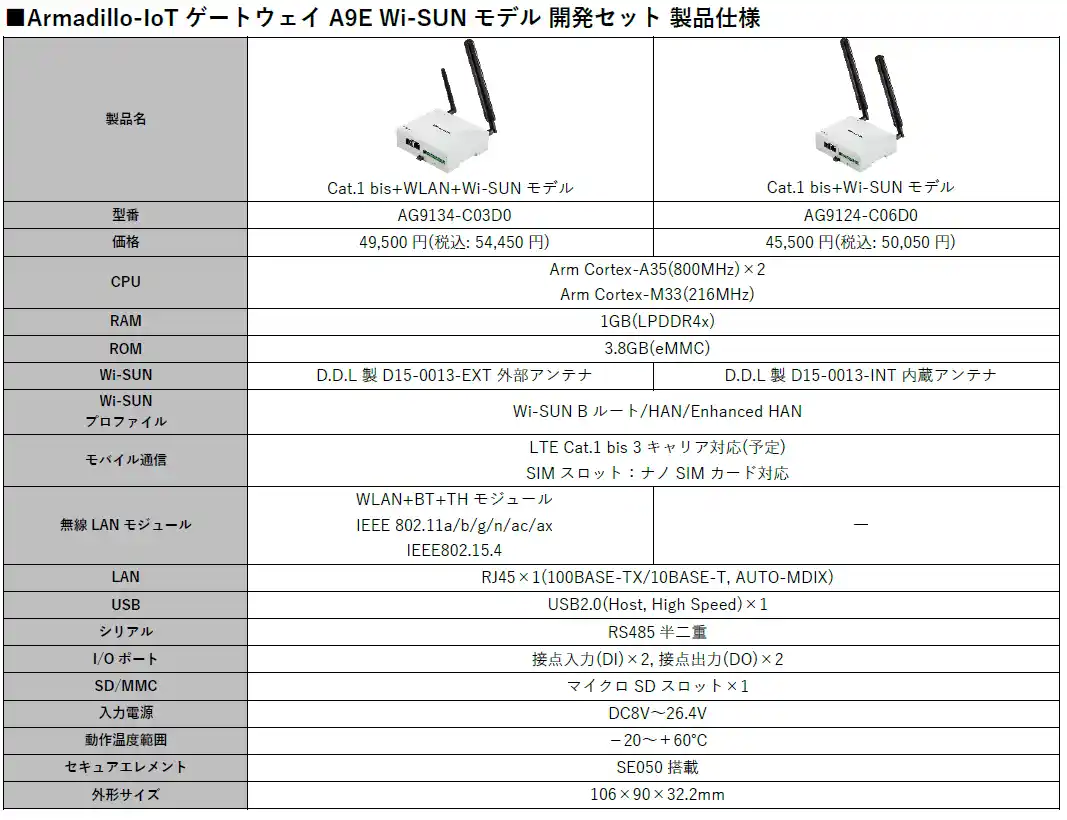 Arm+Linux の組み込みプラットフォーム「Armadillo(アルマジロ)」を提供する株式会社アットマークテクノ(本社:札幌市、代表取締役社長:實吉 智裕)は、Wi-SUN通信可能なゲートウェイとして「Armadillo-IoTゲートウェイ A9E Wi-SUNモデル(以下、本製品)」を開発しました。 |