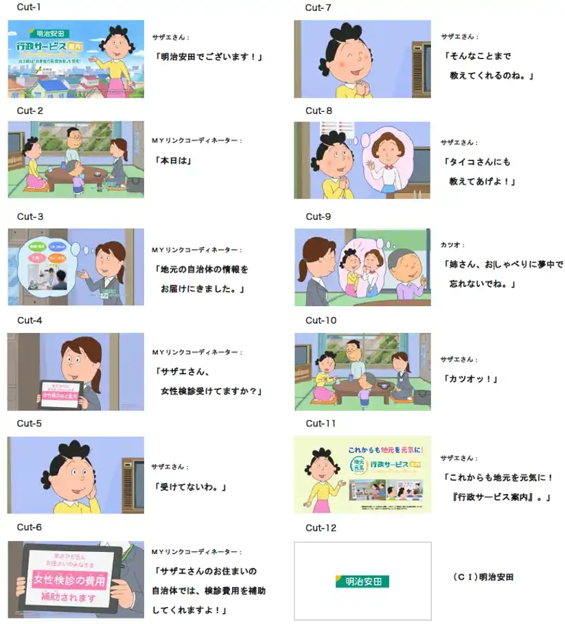 本CMは「MYリンクコーディネーター」が、サザエさん一家に対して、自治体が提供する女性検診などの行政サービスを案内する内容です。サザエさんたちが暮らす「あさひが丘」を舞台に、日常生活に役立つ行政サービスの情報を紹介しています。 |
