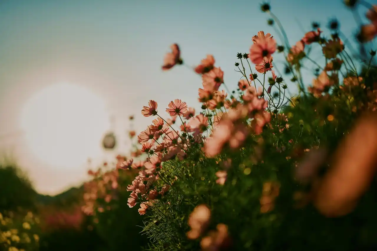 夕陽を浴びた「四季の庭 -よろこびの庭-」のコスモス畑 |