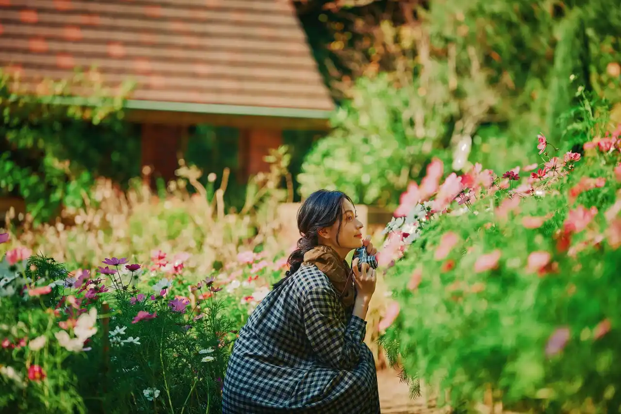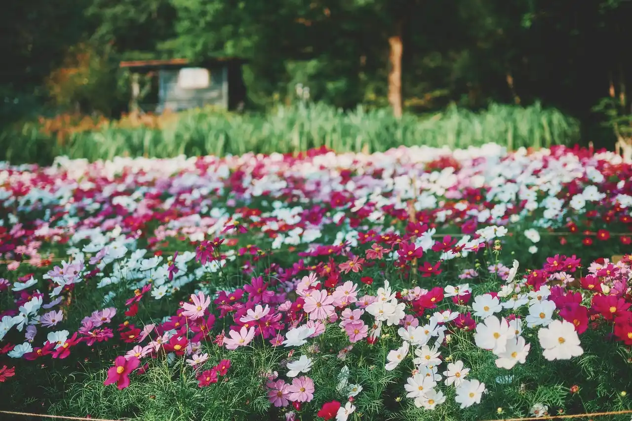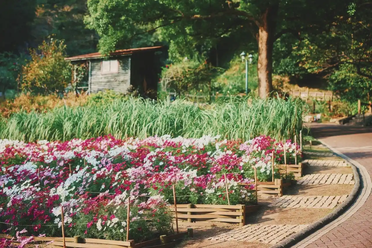 おもてなし、くつろぎ、よろこび、いやしの4つのテーマからなる「四季の庭」。ハーブのある暮らしをテーマにした「四季の庭 -よろこびの庭-」では、シェッド(小屋)を背景に段々と連なるコスモ畑の中に入って秋を満喫していただけます |