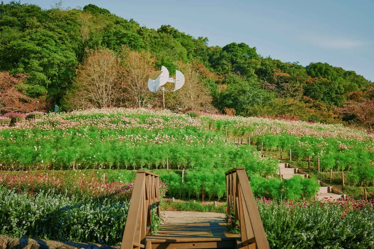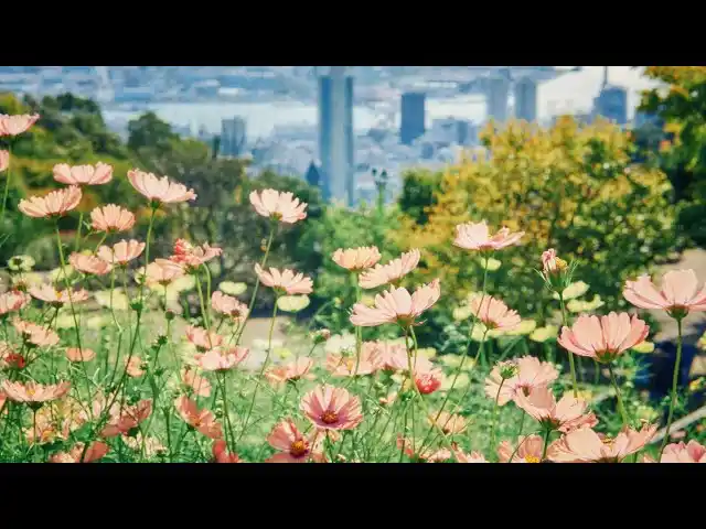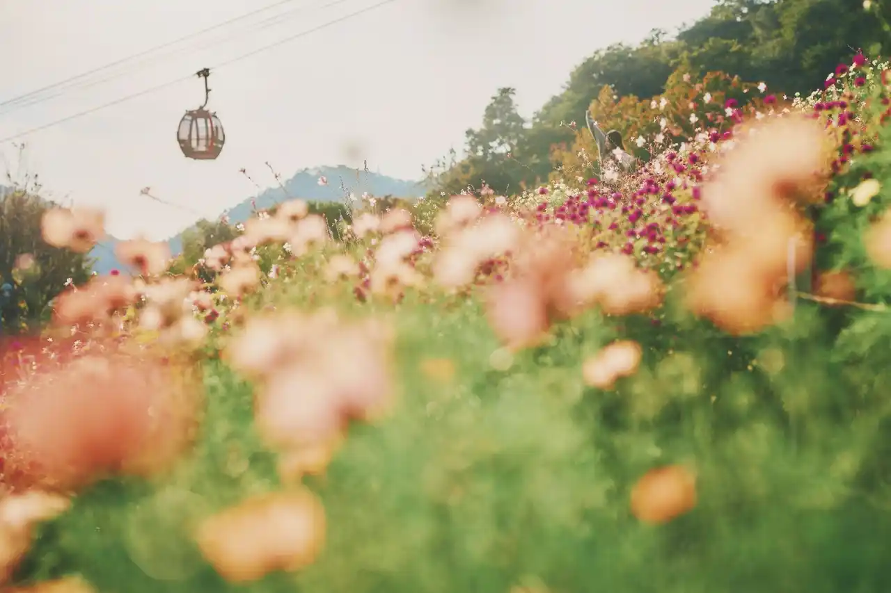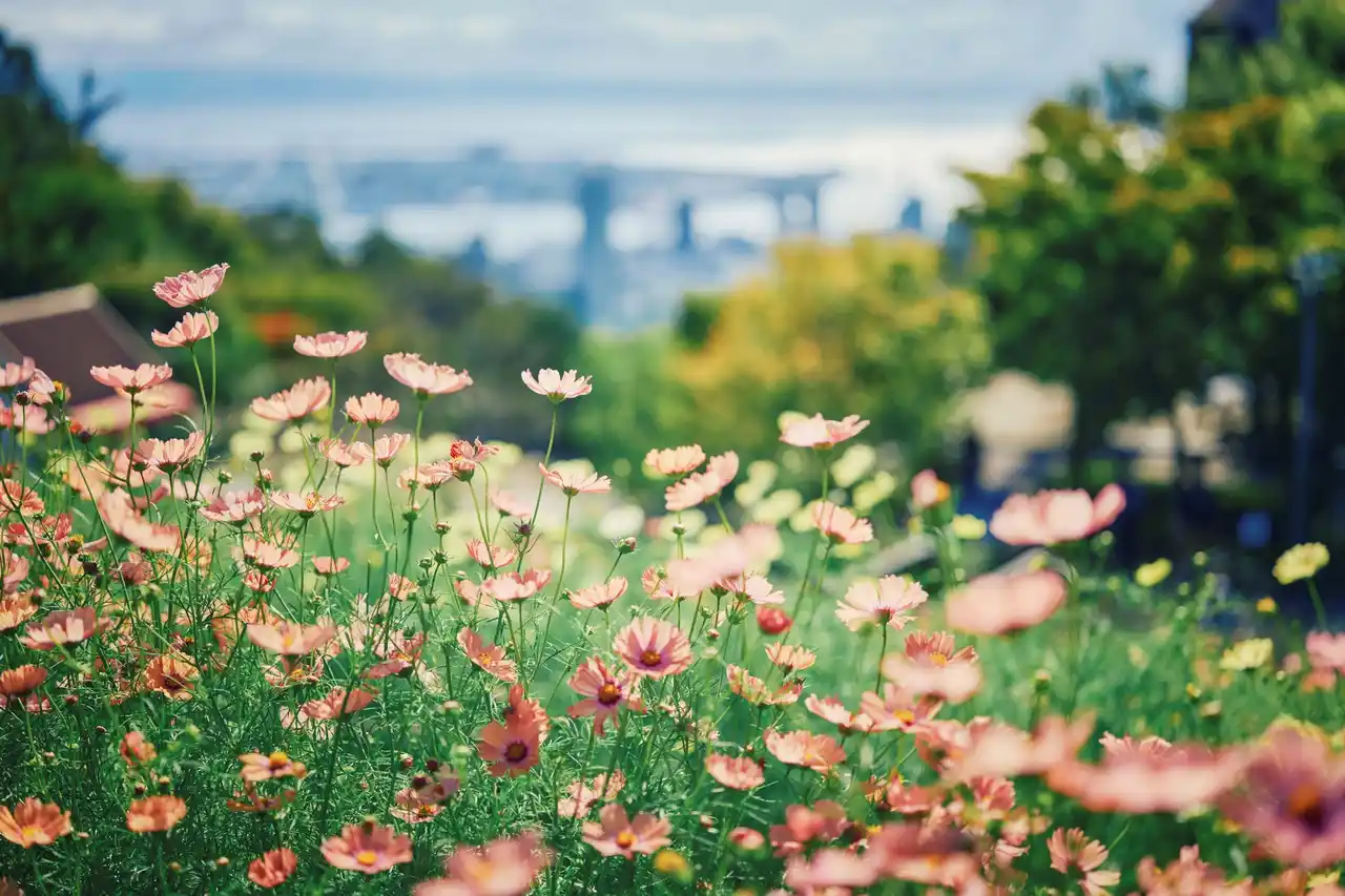 標高400mの山上に位置し、港町神戸の街並みが一望できるリゾート施設「神戸布引ハーブ園/ロープウェイ」(運営:神戸リゾートサービス株式会社)は、秋を彩る主役のひとつが「コスモス畑」が見ごろを迎えました。可憐なピンクのコスモスをメインに、色鮮やかなセンニチコウ、蝶の様な小花が美しいガウラなどが咲き集い秋の風景を演出します。秋風に揺られ、朝、昼、夕と時間の経過とともに移り変わる情景は「秋の定番フォトスポット」として賑わっています |