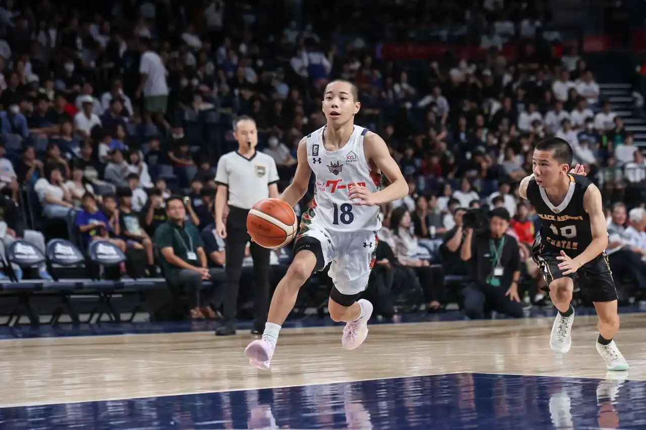 #18 宮城選手が3Pシュートを沈めます。さらに#18 宮城選手がスティールを奪い、#9 嶺井翔太選手がゴール下の競り合いから2Pシュートを流し込みます。#17 末広瀬嵐選手がオフェンスリバウンドを奪い2Pシュートを流し込みます。#18 宮城選手がペイントアタックからレイアップシュートで加点。#8 與那嶺昊選手、#12 大城選手が力強いペイントアタックで得点を重ねます。43-18で前半を終了します。 |