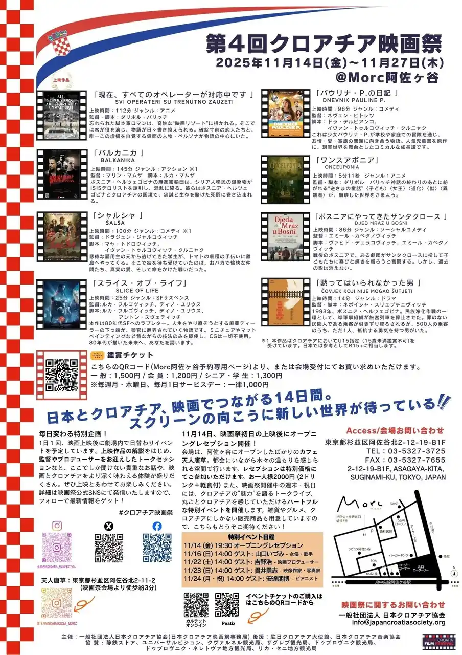 名 称:第4回クロアチア映画祭(Japan Croatia Film Festival 2025) 会 期:2025年11月14日(金)~11月27日(木) 会 場:Morc阿佐ヶ谷 (東京都杉並区阿佐谷北2丁目12−19) 主 催:一般社団法人 日本クロアチア協会 後 援:駐日クロアチア大使館、日本クロアチア音楽協会 |