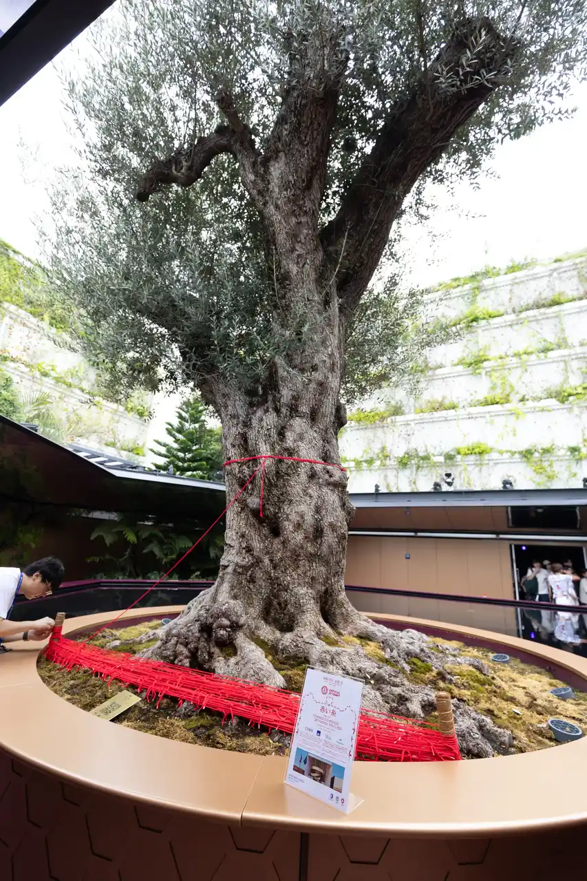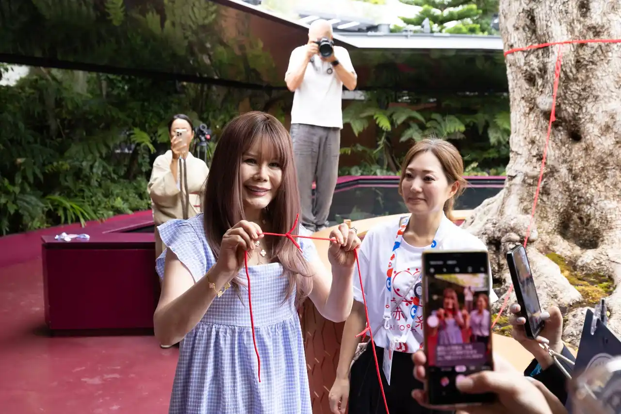 ミラクルガーデンを象徴する千寿オリーブ "若さの樹(Tree of Youth)"に結ばれた赤い糸がスタートとなり、270名の参加者が、伸びてゆく糸に想いを込めて結び目を作りました。 |