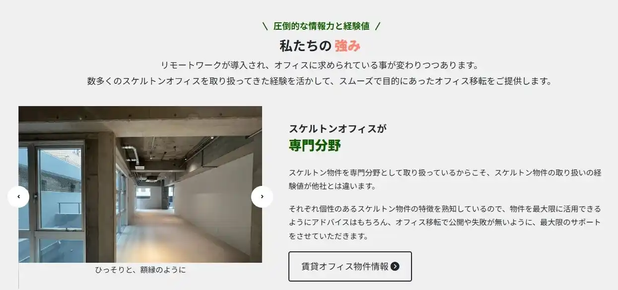 | 顧客の「こういった物件を探してほしい」という特定の要望に応えるため、代表の久田はこのニッチな市場をターゲットにし、「スケルトンオフィス東京」というブランドを確立しました。このブランドの設立は、単なる物件探しにとどまらず、顧客が求める理想的なオフィス空間を提供するための明確なビジョンと方向性を持った事業となりました。 | |||||||||||||||||||