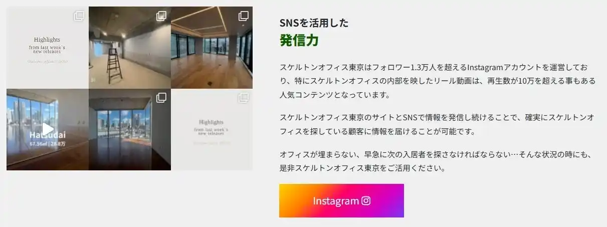 スケルトンオフィス好きなフォロワーが1.5万にいるために、 スケルトンオフィス東京のInstagramに投稿するとスケルトンオフィスを探している候補者に直接アプローチできることで、成約率をアップしています。 居抜きオフィス物件を検索できるサイトは増えましたが、入居者候補へのアプローチする機会は少なく、基本的には掲載後、問合せ待ちしか選択肢がありません。 私たちでは、ターゲットを顧客にしているので個別に紹介して成約することができています。 実際に、今まで募集して3ヶ月お問合せがない物件でも、 サイト上に掲載することでお問合せが急に増えて、成約に至った事例は少なくありません。 顧客の希望するスケルトンオフィスを世の中に増やすために始めた取り組みですが、 貸主様からも喜ばれるサービスに成長しております。 |