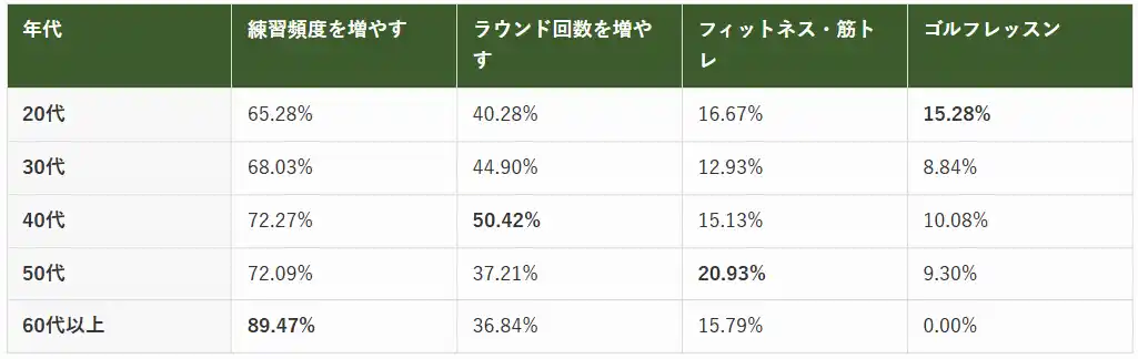また、40代が「ラウンド回数を増やす」において50.42%と全年代中最も高い割合を示していることから、20代は技術向上とラウンド体験のバランス、30~40代は実践重視、50代以上は基礎と体力の再構築という年齢による学習スタイルの明確な違いが浮き彫りになっています。 |