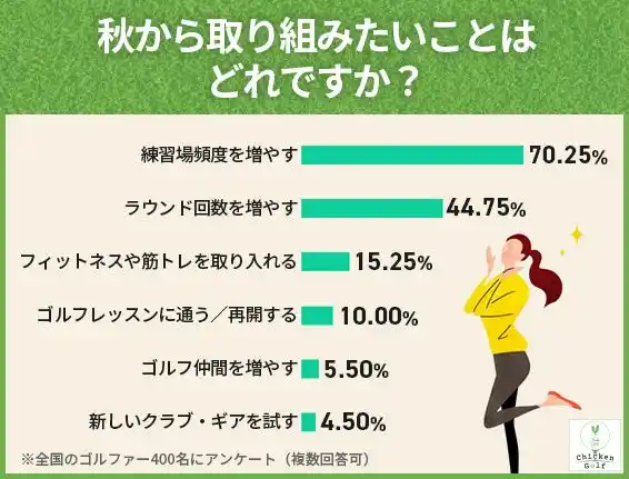 秋の再開に意欲を示しているゴルファーのうち、70.25%のゴルファーが「練習場頻度を増やす」ことを最優先課題に挙げており、これは夏期のブランクを埋めるために基礎練習の必要性を強く感じていることを教示しています。 |