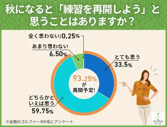 「いつからゴルフ練習を再開するのが最適か」尋ねると、秋になると練習を再開したいと考えるゴルファーが全体の93.25%に達し、夏期の練習離れから一転して、圧倒的多数が前向きな気持ちを示していることが明確になりました。 |