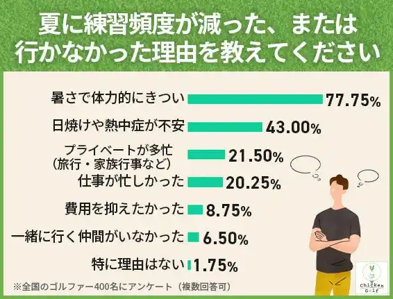 さらに「仕事が忙しかった」20.25%を合わせると、約4割のゴルファーが時間的制約を夏期の練習減少理由として挙げています。 |