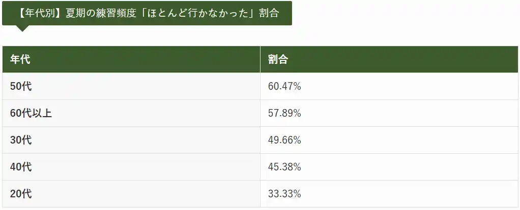 中でも30代では約半数が練習にほとんど行っておらず、「子どもが夏休み」「家族行事が多忙」といった夏季特有のライフイベントが、この世代に集中的に影響していると考えられるでしょう。 |