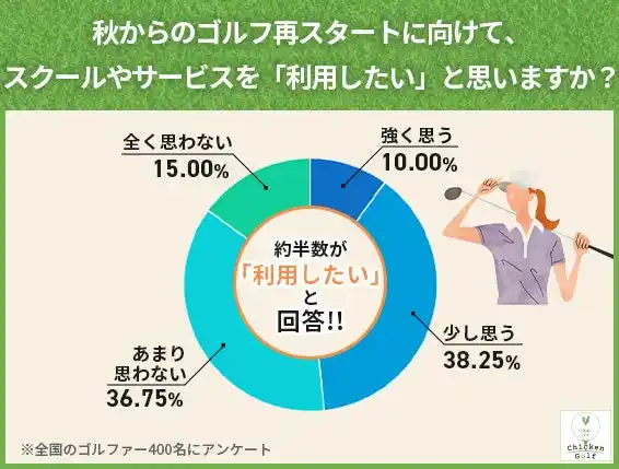 夏にゴルフ練習を制限していたゴルファーに「秋からのゴルフ再スタートに向けたスクールやサービスへの関心」について尋ねたところ、「利用したい」と考えるゴルファーが193人(48.25%)に達し、ほぼ半数が専門的な指導への関心を示していることが明らかになりました。 |