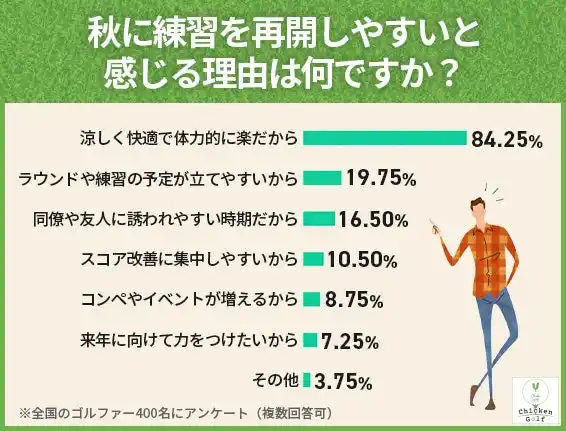夏期に約半数のゴルファーが練習やラウンドを大幅に制限した一方で、93.25%が秋の再開に意欲を示し、84.25%が「涼しく快適で体力的に楽だから」と気候的優位性を認識していることが判明しています。 |