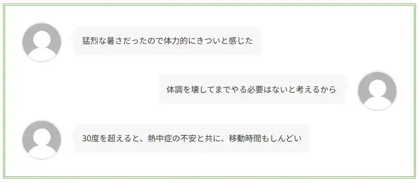 中には「早朝から回っても、ハーフ終えた時点で35℃を超えておりいのちの危機を感じる」との声もあり、ゴルファーが命に関わるリスクとして暑さを認識していることが分かります。 |