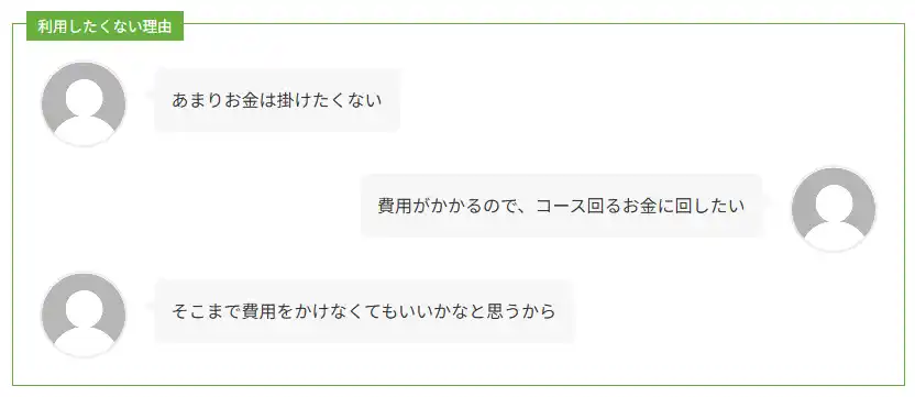 利用したくない理由について尋ねると、『経済的要因』が圧倒的で、以下のような声が見受けられました。 |