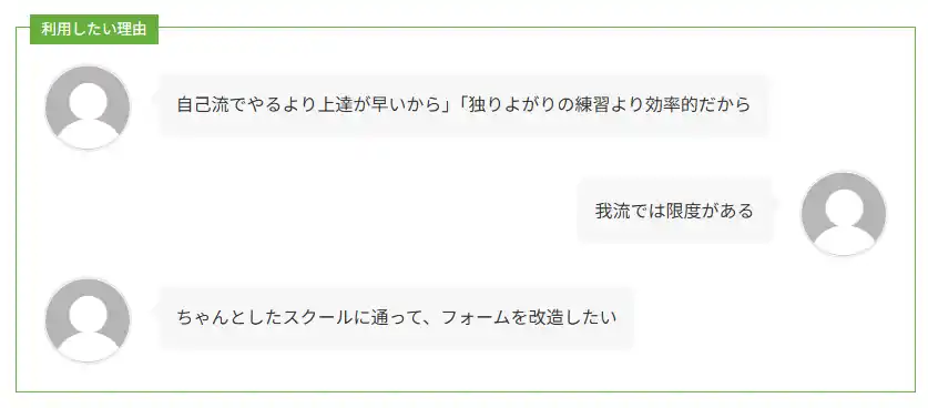 これらの回答から、スクール利用を検討している層は単なる一時的な改善ではなく、持続的な技術向上と正しい基礎の習得を重視していることが分かります。 |