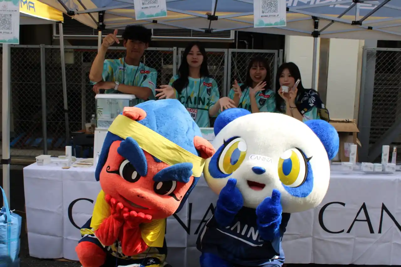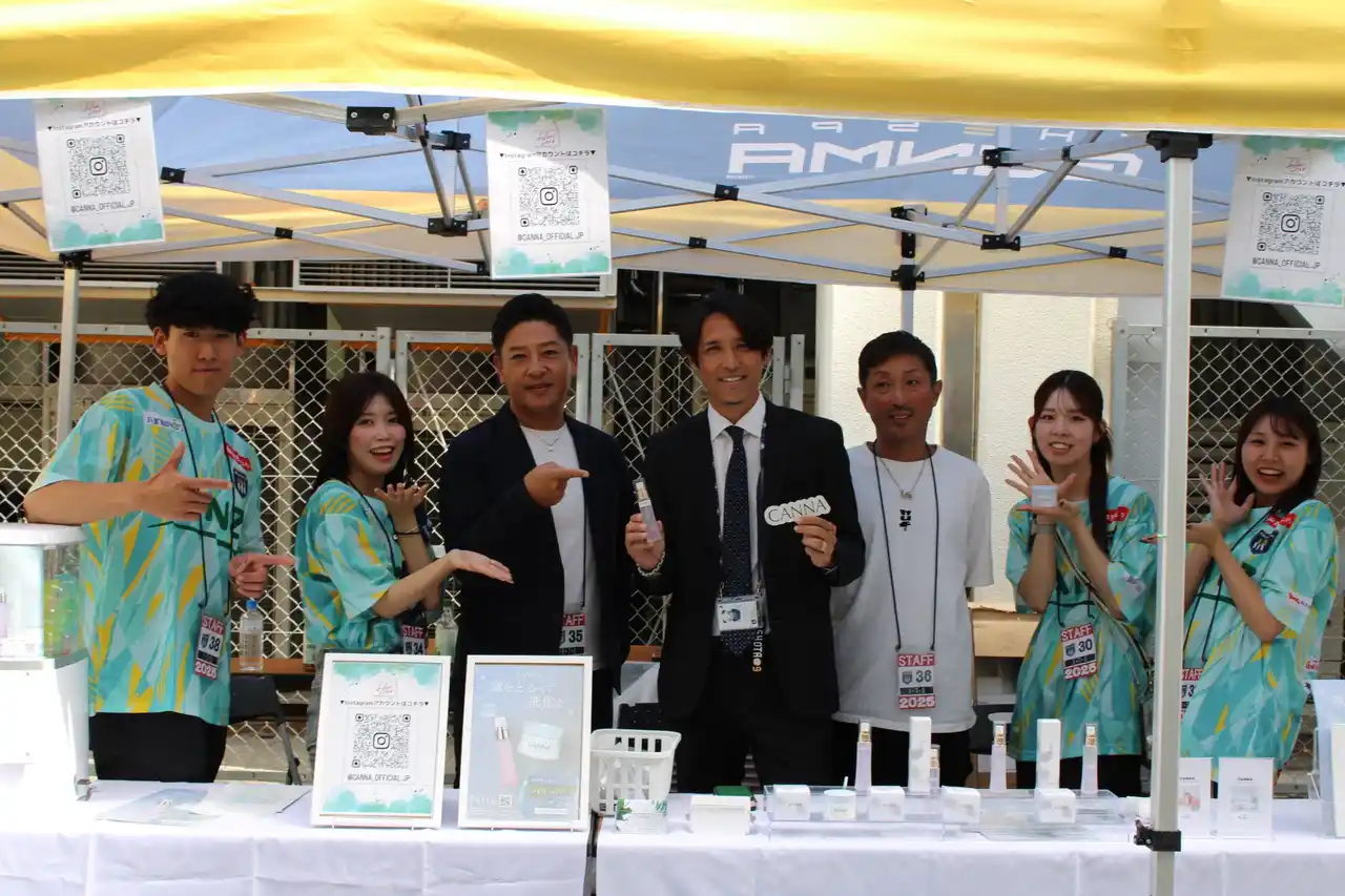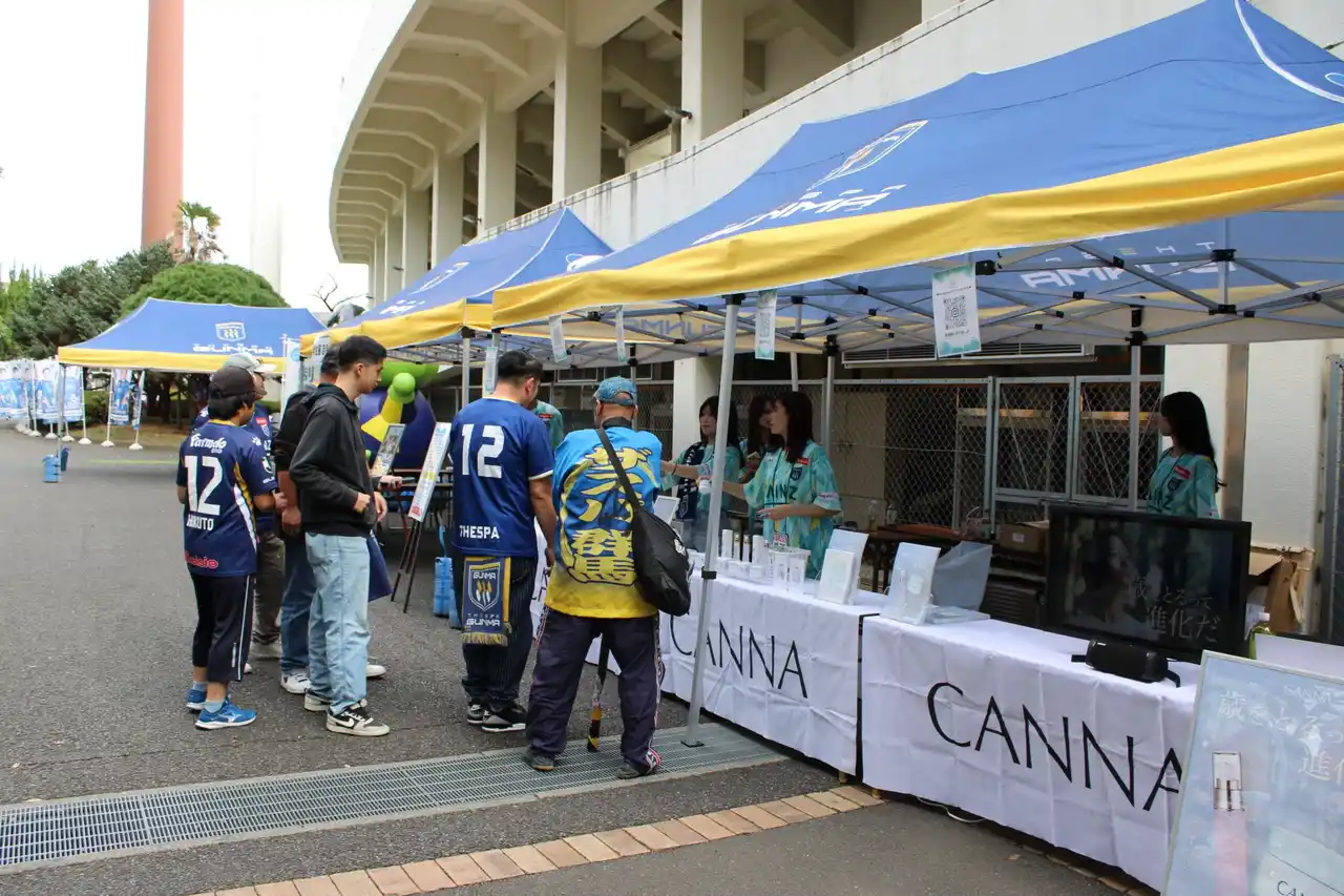 当日は、試合前のスタジアム場外にて自社ブランド「CANNA(カンナ)」のブースを出店。オンライン限定で展開しているCBD配合スキンケア商品を実際にお試しいただける体験会やサンプル配布を行いました。 |