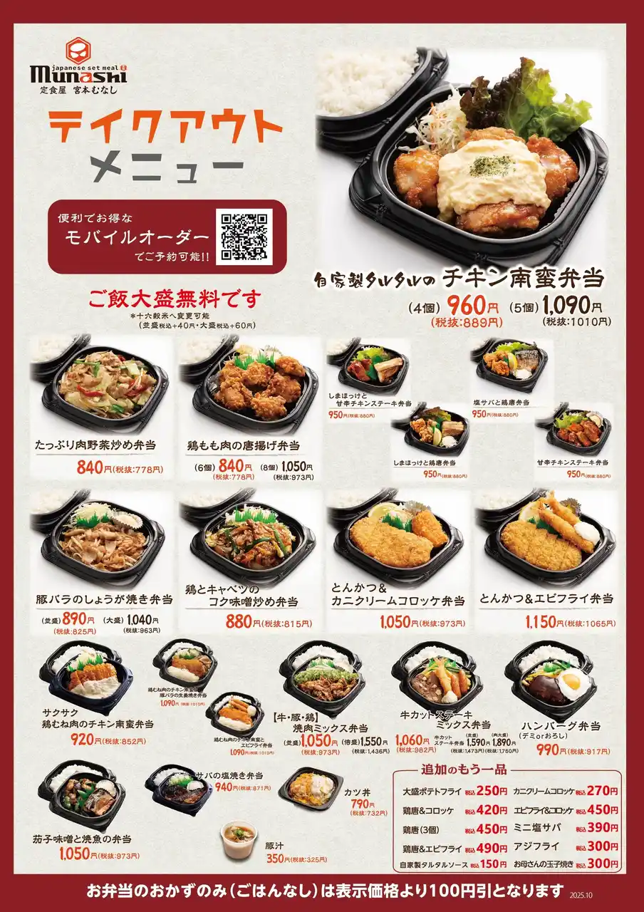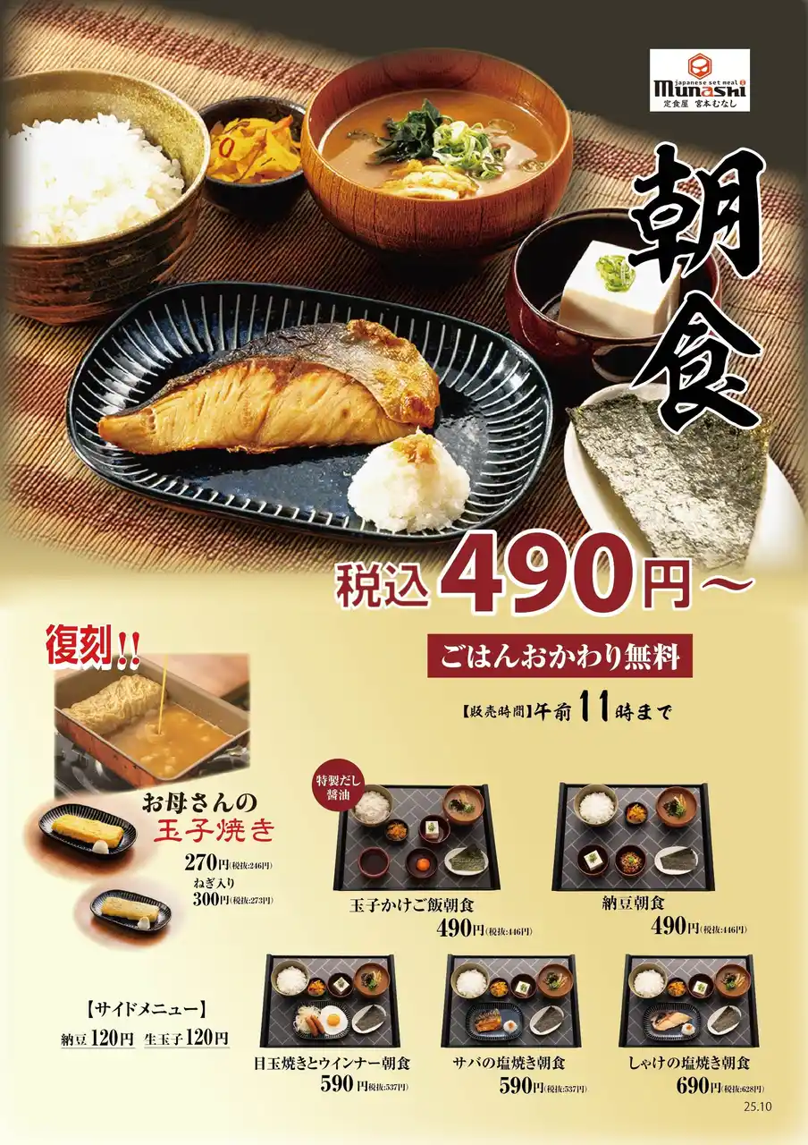 M&Sフードサービス株式会社(本社:大阪府大阪市、代表取締役社長:夏井 克典)が運営する定食チェーン「定食屋 宮本むなし」では、グランドメニューを改定し秋冬にピッタリな新メニューを2025年10月22日(水)より販売開始します。 |