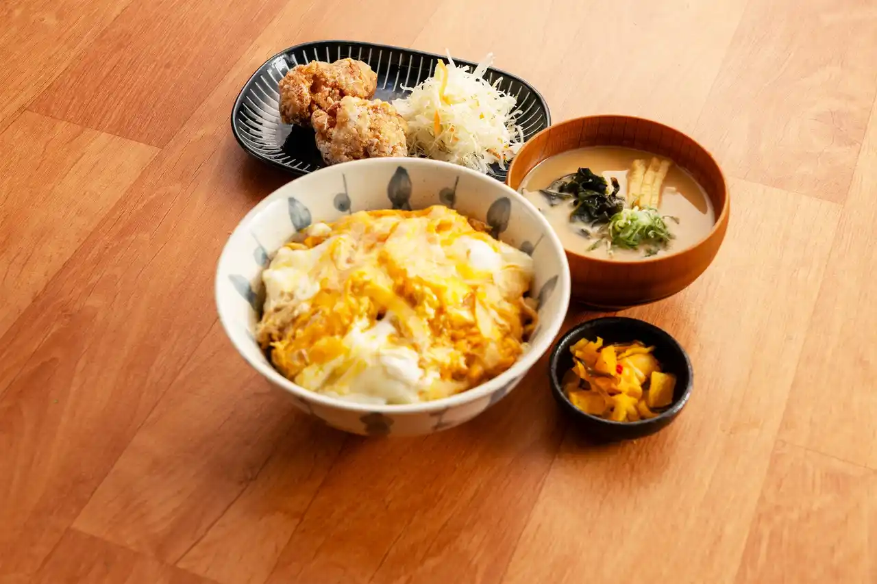 やさしいお出汁とトロトロ玉子のどんぶりと、鶏の唐揚げ2個のセットです。 |